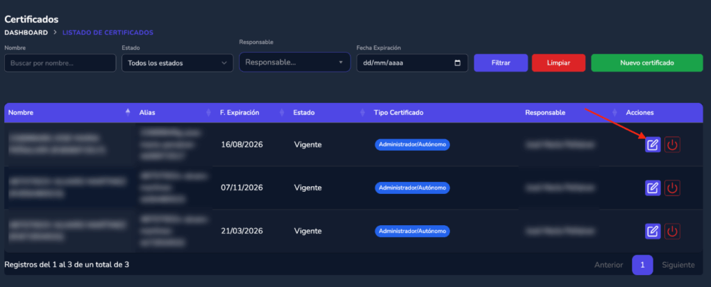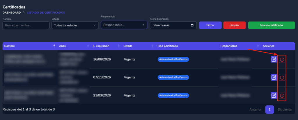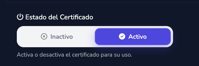 Puedes activar o desactivar un certificado activo desde el botón de activación ubicado en su registro: