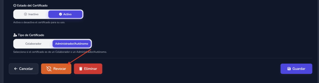 Para revocar un certificado elige «editar» el mismo y haz click en la opción de «Revocar»: